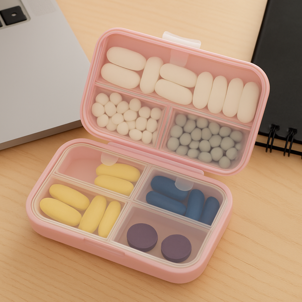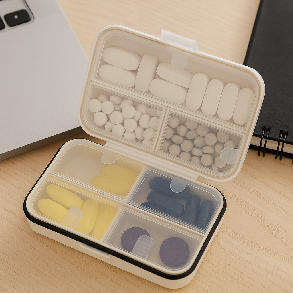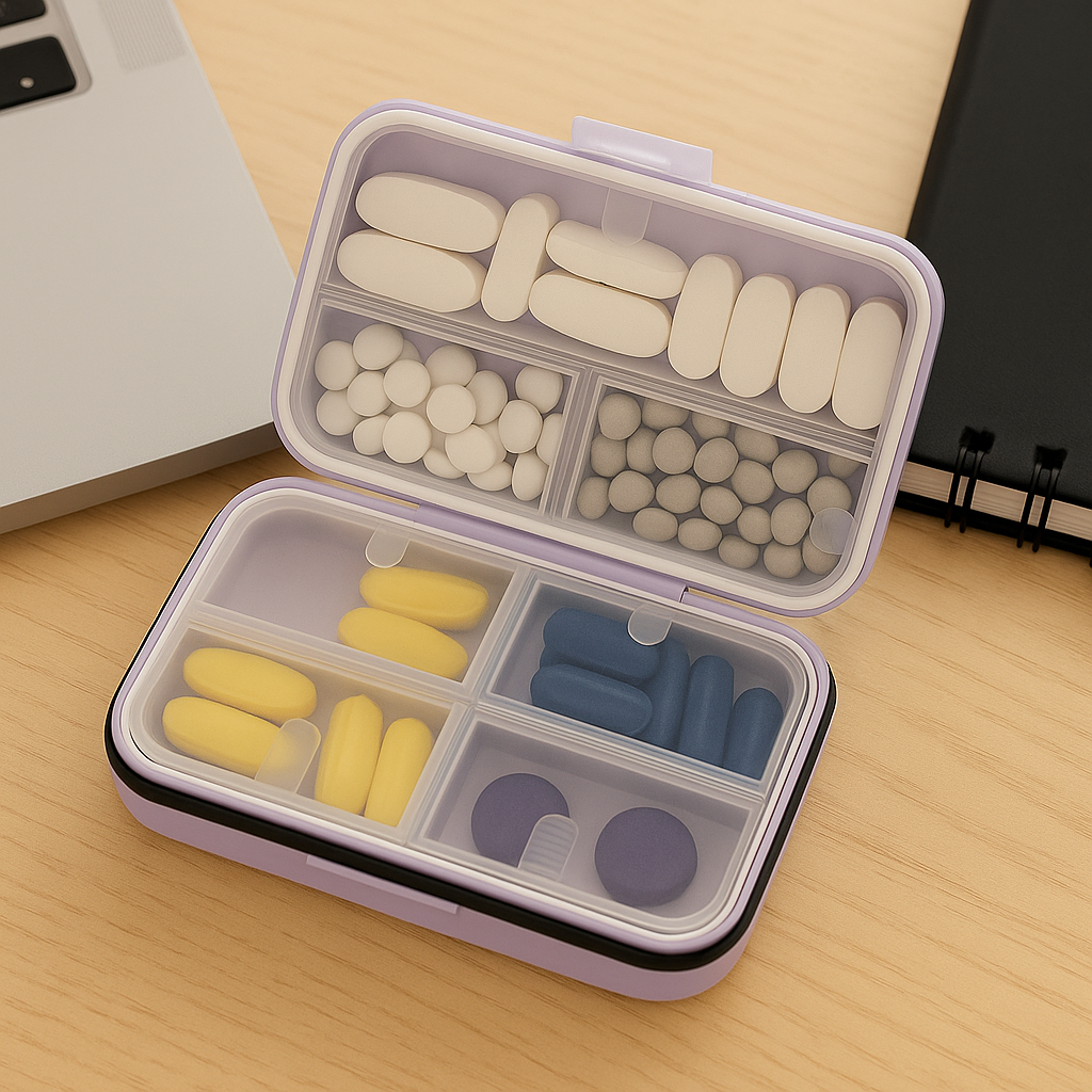Découvrez une solution pratique et élégante pour organiser vos compléments et médicaments, offrant clarté et discrétion pour un quotidien sans stress et une vie saine, où que vous soyez.